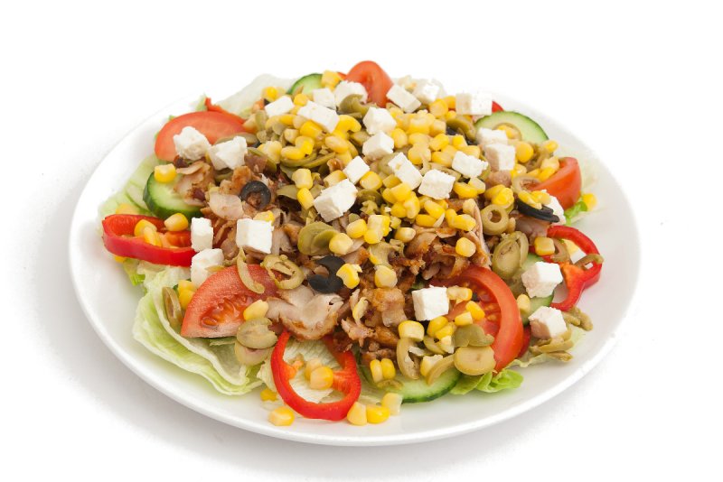čerstvá zelenina, kuřecí maso (kuřecí kousky döner kebab 150g), balkánský sýr, černé nebo zelené olivy, dresing + NÁPOJ ZDARMA